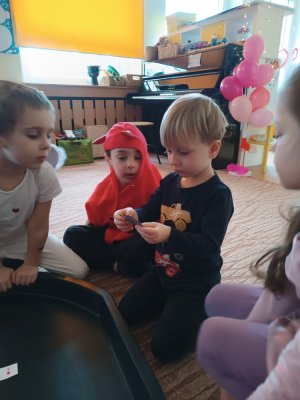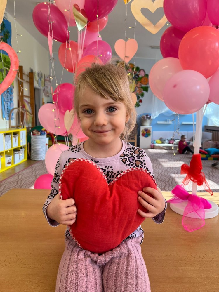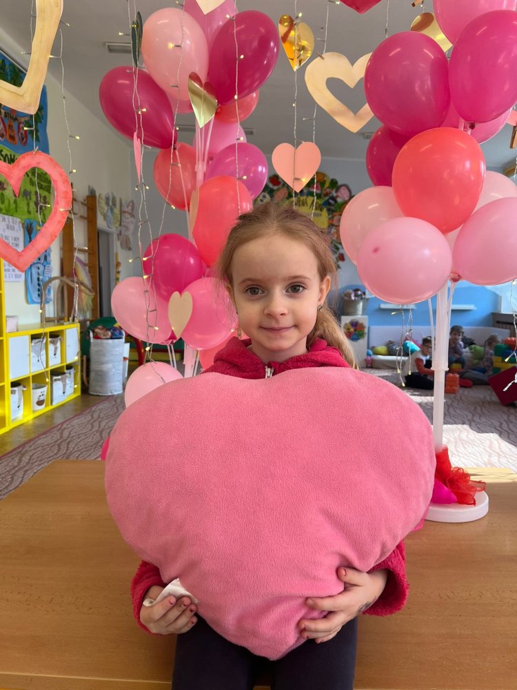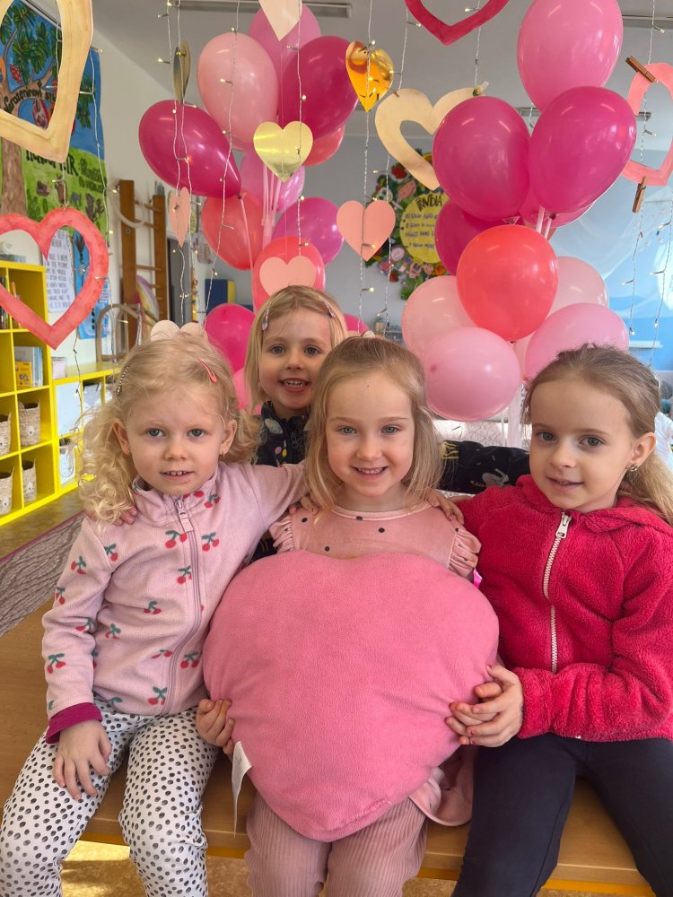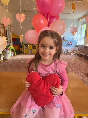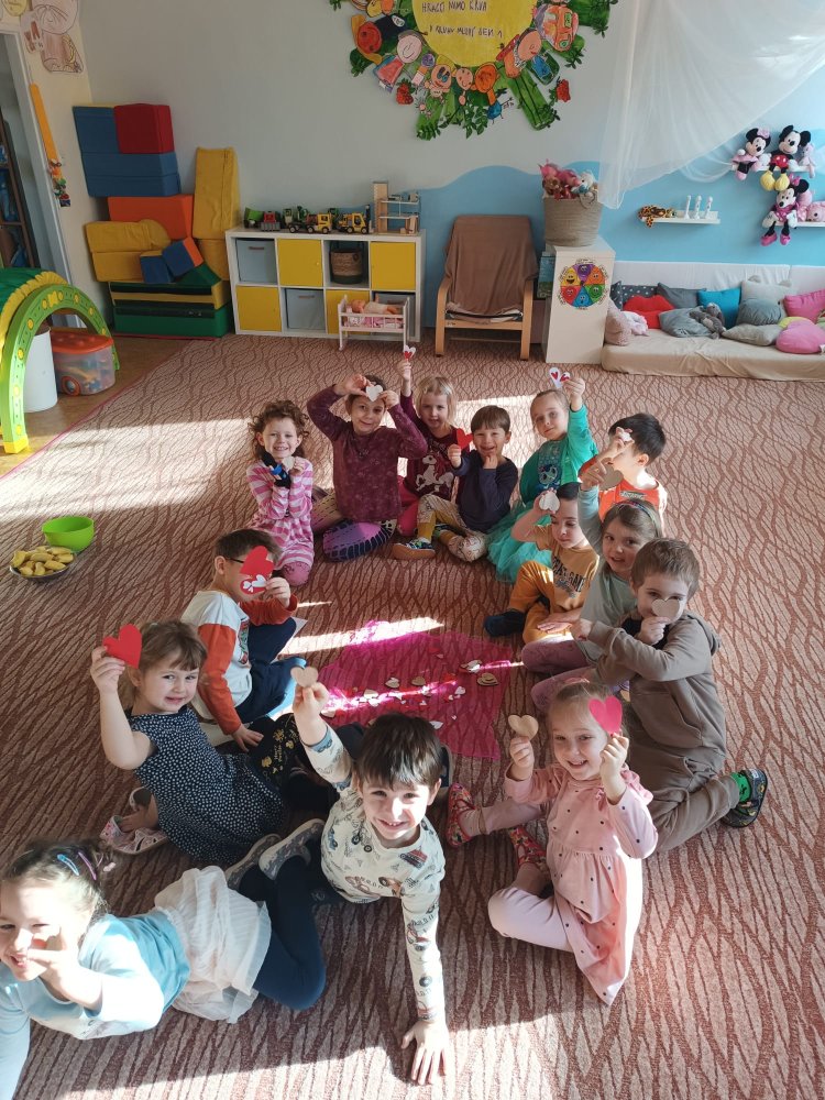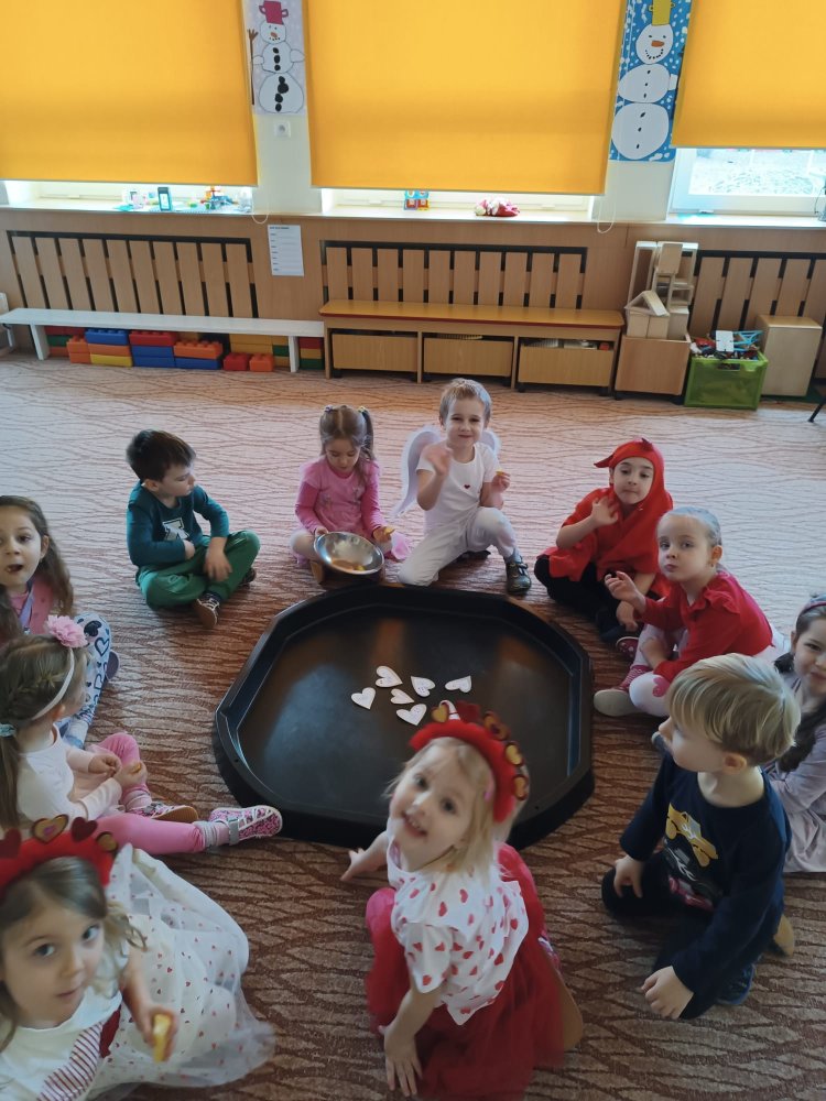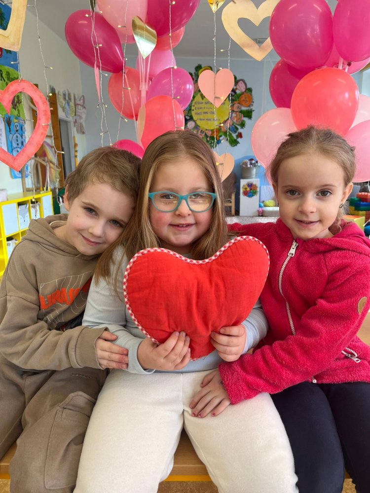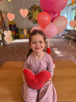 Využili jsme krásné únorové příležitosti popovídat si o lásce, protože se slavil den sv. Valentýna. A tak jsme si povídali o tom, co pro nás znamená láska nebo mít někoho rád. Děti vyjadřovaly své pocity slovy, objetím, kreslením, skládáním srdíček a vytvářením valentýnek. Pak jsme se jeden den oblékli do valentýnského hávu - růžové, srdíčkové oblečení, různé doplňky - čelenky, brýle, dokonce i Amorův luk se šípem a slavili jsme. Vyřešením valentýnské pátrací hry jsme byli odměněni pusinkovými lízátky, vytvořili si valentýnskou galerii z fotek a užili si opět jeden z krásných dnů ve školce.